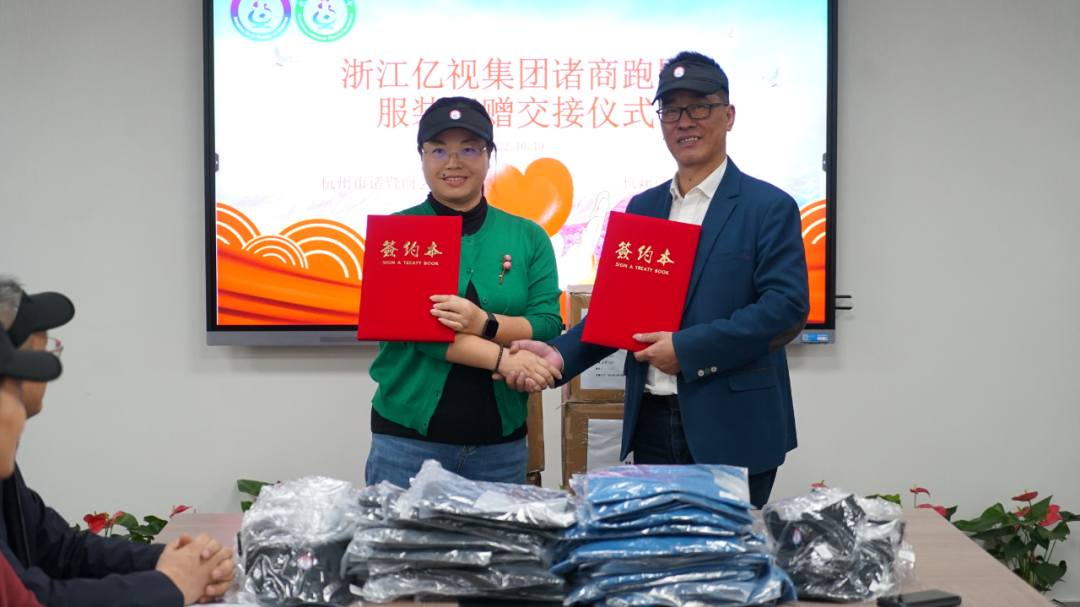 億(yi) 視總裁朱小冬代董事長朱錦奇,通過杭州正版星空官网基金會(hui) 向星空体育网站入口諸商跑團捐贈專(zhuan) 業(ye) 跑步運動服套裝近300套。拱墅諸商秘書(shu) 長陳建均代表商會(hui) 接受捐贈,對億(yi) 視集團的捐贈和商會(hui) 常務副會(hui) 長、拱墅諸商會(hui) 長朱錦奇對諸商跑團的鼎力支持表示感謝。