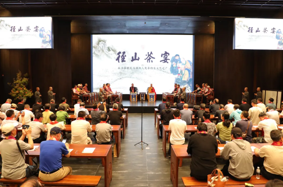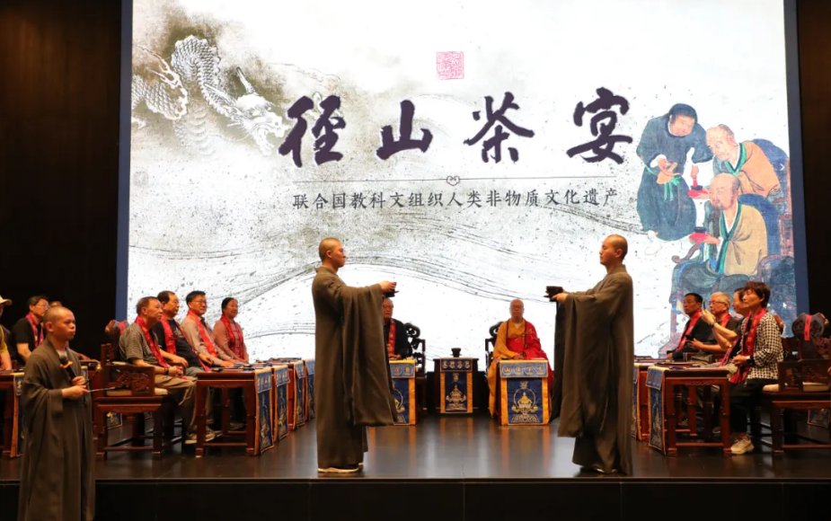 徑山茶宴又稱“徑山茶禮”“徑山茶會(hui) ”,被列入第三批國 家 級非物質文化遺產(chan) 名錄。是徑山寺接待貴賓時的大堂茶會(hui) ,從(cong) 張茶榜、擊茶鼓、恭請入堂、上香禮佛、煎湯點茶、行盞分茶、說偈吃茶到謝茶退堂,有十多道儀(yi) 式程序,融合了禪院清規、儒家禮法和點茶新技法而自成一體(ti) 、獨具一格。眾(zhong) 人一邊品味著清香四溢的徑山茶,一邊交流著對佛教文化與(yu) 茶道融合的感悟。