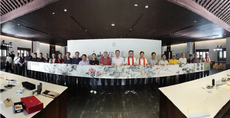 在戒興(xing) 法師揮毫啟卷後,嘉賓與(yu) 書(shu) 畫家們(men) 共同繪製了諸商《雲(yun) 水禪心》和《百花齊放》兩(liang) 幅18長卷,以細膩的苧麻布為(wei) 畫布。畫卷中融入了諸暨的西施浣紗和祖國山水,共同勾勒出諸商創新創業(ye) 美好未來的藍圖。