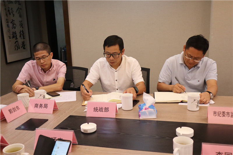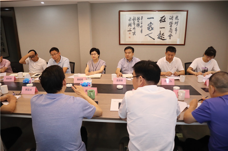 8月28日下午,諸暨市委副書(shu) 記、政法委書(shu) 記潘超英,市委常委、統戰部部長孟國鋒等一行10人,到星空体育网站入口走訪調研商會(hui) 服務諸暨市“與(yu) 杭同城”行動計劃工作情況。星空体育网站入口周全新會(hui) 長和部分常務副會(hui) 長參加座談,並對“與(yu) 杭同城”工作的落實提出相關(guan) 建議。諸暨市紀委市監委、市委辦、統戰部、發改局、商務局分管領導,安華鎮郭劍東(dong) 書(shu) 記和相關(guan) 人員參加,商會(hui) 常務副會(hui) 長李國光、馮(feng) 汝章、何海文、柴漢峰、張湧森等參加座談並發表建議。